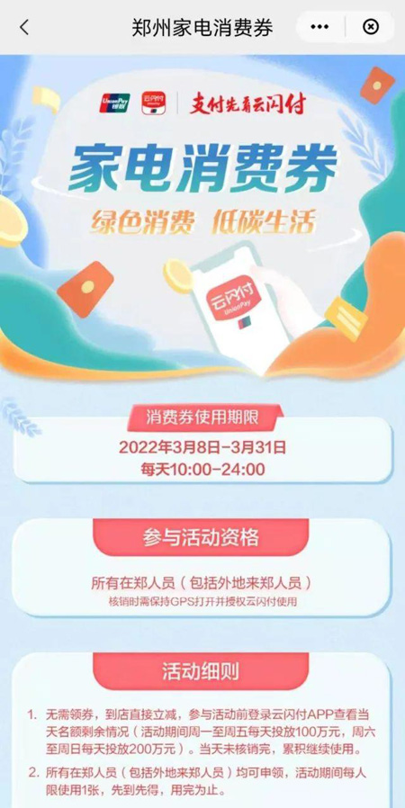 3月8号到31号,郑州将陆续发放3000万家电消费券鼓励居民购买绿色家电。工作日每天发放100万元,周六周日每天发放200万元。3月8号郑州家电消费券发放首日,市民仅用时25分钟就将100万的消费券核销一空。数据显示,消费券使用第一天,直接带动消费近800万元。消费券使用现场核销的方式,满2000元减400元。消费券作为本轮绿色促消费活动之一。